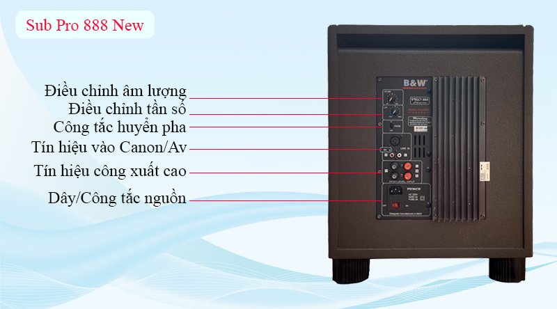 - Subwoofer B&W được nhà sản suất trang bị 3 chuẩn Jack RCA, XLR( line in) và HIGH LEVEL INPUT tín hiệu vào.