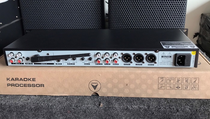 Mặt sau gồm cổng nguồn chống giật, cổng kết nối loa sub, nút chỉnh cắt sub, cổng kết nối loa center, đầu vào micro và cổng kết nối với các thiết bị âm thanh khác.